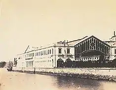 The actual project to construct the station at Cais dos Soldados was approved by the government on 8 March 1854.[3] The plan presented a station that included distinctive elements for commercial and passenger traffic, repair workshops, warehouses and services. For the passenger terminal, the government acquired the old Convent of Santa Apolónia, but the former army arsenal in the location was demolished to make way for the final design. From the beginning, the rail line and the commercial wharf required that land be reclaimed along the Tagus River.[4]