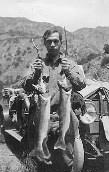 Historic documentation of an important recreational steelhead trout (Oncorhynchus mykiss) fishery occurs for the Santa Clara River into the mid 1900s.[18] The steelhead trout run on the Santa Clara river prior to 1940 is estimated to have had thousands of fish and to have been one of the largest steelhead runs in southern California.[19] Construction of the Vern Freeman Diversion Dam and other migration barriers on the mainstem, Santa Paula Creek, Sespe Creek, Piru Creek, and other tributaries during the mid 1900s appear to be correlated with the demise of the steelhead run as habitat availability decreased and surface flows decreased.[18][19] Adult steelhead still try to migrate up the river with an adult trapped at the Vern Freeman Dam in 2001. A wild rainbow trout population still exists in the headwaters of the Santa Paula, Sespe, Hopper, and Piru Creek tributaries and is producing out-migrating steelhead smolts bound for the Pacific.[18] However, challenges to outgoing smolt migration include low to no stream flows downstream of the dam or predation in the coastal estuary.[20] Lampreys, a parasite, also impact the steelhead.[21] Invasive species such as Arundo donax also create changes that are not favorable to spawning trout.[22] Genetic analysis of the steelhead in the Santa Clara River watershed has shown them to be of native and not hatchery stocks.[23]