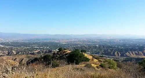 Santa Clarita lies within the Santa Clarita Valley, bounded by the San Gabriel Mountains to the east, the Santa Susana Mountains to the south and west, and the Sierra Pelona Mountains to the north, all part of the Transverse Ranges. The Santa Clara River passes through the city from east to west; it is usually dry and flows only after episodes of heavy rainfall. Within the surrounding mountains are hiking trails including Agua Dulce Canyon, Central Park, East Walker Ranch, Elsmere Canyon, Golden Valley Ranch, Haskell Canyon Open Space, Quigley Canyon, East Canyon, Fish Canyon, San Francisquito Open Space, Tapia Canyon, Towsley Canyon, and Wildwood Canyon.[32] The city limits extend into the Angeles National Forest.[33] The Newhall Pass is located at the southern end of the city, south of Newhall and north of the San Fernando Valley community of Sylmar.