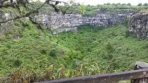 The island is an oval-shaped, 32 km (20 mi) long and 40 km (25 mi) wide shield volcano. Its summit contains a shallow caldera that has been largely buried by youthful pit craters and cinder cones with well-preserved craters. The most recent eruptions may have occurred only a few thousand years ago with the effusion of sparsely vegetated lava flows from vents on the north flank and along the summit fissure.[5] A gigantic lava tube measuring over 2,000 m (6,600 ft) long is a tourist attraction on the island. As a testimony to its volcanic history there are two big holes formed by the collapse of a magma chamber: Los Gemelos, or "The Twins".[6][7]