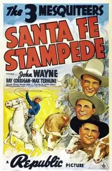 Santa Fe Stampede is a 1938 American "Three Mesquiteers" Western film[1] directed by George Sherman and starring John Wayne, Ray Corrigan, and Max Terhune. Wayne played the lead in eight of the fifty-one films in the popular series.