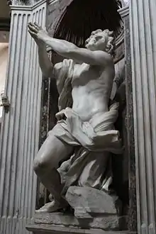 The funeral monument of Princess Maria Flaminia Odescalchi Chigi is sometimes dubbed the "last Baroque tomb in Rome".[42] It is probably the most visually stunning, exuberant and theatrical sepulchral monument in the basilica. It was built in 1772 for the young princess, the first wife of Don Sigismondo Chigi Albani della Rovere, the 4th Prince of Farnese, who died in childbirth at the age of 20. It was designed by Paolo Posi, a Baroque architect who was famous for his ephemeral architecture built for celebrations, and executed by Agostino Penna. The tomb is located by the pillar between the Chigi and Montemirabile Chapels.
