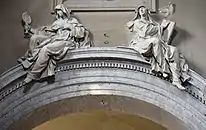 One of most important Mannerist funeral monuments in the basilica is the tomb of Cardinal Gian Girolamo Albani, an influential politician, jurist, scholar and diplomat in the papal court in the last decades of the 16th century. He died in 1591. The Late Renaissance monument is one of the main works of the Roman sculptor, Giovanni Antonio Paracca. The bust of the Cardinal is a realistic portrait of the old statesman. He is seen praying with his head turned toward the main altar. Facing this monument the cenotaph of Cardinal Giovanni Battista Pallavicino (1596) is likewise attributed to Paracca.