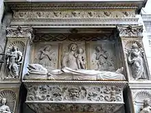 On this tomb the skeleton is not the personification of Death as in other Baroque tombs but a representation of the deceased (the transi image) on his way towards the resurrection and due to this "death became a symbol for life".[41]