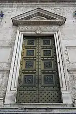 The main door is more monumental that the others. Its pointed pediment is filled with a sculpture of the Madonna and the Child set in a scallop shell. The rim of the niche is decorated with cherubs among six-pointed stars and whiffs of clouds. The frieze has a fine carved decoration of artificial foliage, pecking birds and three putti who are holding torches and oak branches in their hands and carrying bowls of fruit on their heads. The coat-of-arms of Pope Sixtus IV on the lintel is encircled by oak branches. The carvings around the door are the only significant sculptural decorations on the façade and as a whole they summarize the iconographic program of the Sistine rebuilding. The central motif is the Madonna del Popolo surrounded by the symbols of heavenly light and paradisiacal abundance, intertwined with the emblem of the Della Rovere dynasty, and set in a perfectly classical frame.