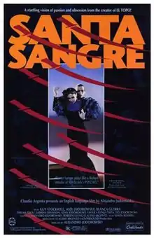 Santa Sangre (English: Holy Blood) is a 1989 avant-garde surreal horror film directed by Alejandro Jodorowsky and written by Jodorowsky along with Claudio Argento and Roberto Leoni. It stars Axel Jodorowsky, Adán Jodorowsky, Teo Jodorowsky, Blanca Guerra, Thelma Tixou, and Guy Stockwell. An international co-production of Mexico and Italy, the film is set in Mexico, and tells the story of Fenix, a boy who grew up in a circus and his struggle with childhood trauma.