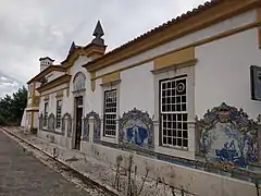 The station building followed a traditional Portuguese building design from the 17th and 18th centuries. Additionally, it was decorated with panels of azulejo tiles representing various aspects of the farming activities of the town as well as views of the town. These were mainly paid for by the Municipality of Santiago do Cacém and were manufactured by the Sant'Anna Factory in Lisbon. The interior has a single floor decorated with patterned tiles. Houses were built next to the station to house the Station Master and other staff. The station was closed in the 1980s. For a time the building was used as a bar but in 2020 it was not being used.[2][4]