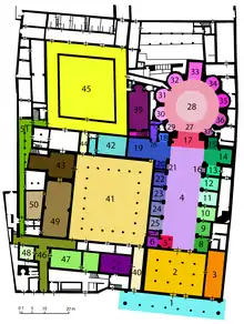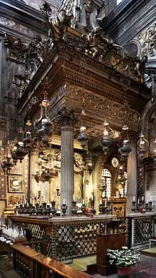 This miracle he attributed to an angel.[1] The painting now housed in the church, acquired increasing veneration, such that in 1444 the Gonzaga family from Mantua financed a special tribune. Initially Michelozzo, who was the brother of the Servite prior, was commissioned to build it, but since Ludovico III Gonzaga had a special admiration for Leon Battista Alberti, this latter architect was given the commission in 1469. Alberti's designs were constricted by the pre-existing foundations. Construction was completed in 1481, after Alberti’s death. Though the structure was refurbished in Baroque-style in the seventeenth century, the basic scheme of a domed circular space flanked by altar niches is still evident.[2]