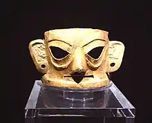 The most striking finds were dozens of large bronze masks and heads (at least six with gold foil masks originally attached) represented with angular human features, exaggerated almond-shaped eyes, some with protruding pupils, and large upper ears. Many Sanxingdui bronze faces had traces of paint smears: black on the disproportionately large eyes and eyebrows, and vermillion on the lips, nostrils, and ear holes.[20] Vermillion is interpreted "not be coloring but something ritually offered for the head to taste, smell, and hear (or something that gave it the power to breathe, hear, and speak)." Based upon the design of these heads, archeologists believe they were mounted on wooden supports or totems, perhaps dressed in clothing.[21] Liu Yang concludes "masked ritual played a vital role in community life of the ancient Sanxingdui inhabitants", and characterizes these bronze ritual masks as something that may have worn by a shi (尸; 'corpse') "personator, impersonator; ceremonial representative of a dead relative".[22]