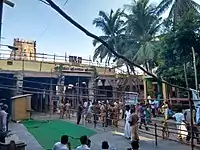 The temple follows Pancharatra Agama and Vadakalai tradition.[7] The temple priests perform the puja (rituals) during festivals and on a daily basis. Like other Vishnu temples of Tamil Nadu, the priests belong to the Brahmin Vaishnavite sect, which is dedicated to Vishnu. The temple rituals are performed six times a day; Tiruvanandal at 8:00 a.m., Kala santhi at 9:00 a.m., Uchikalam at 12:30 p.m., Ntiyanusandhanam at 6:00 p.m., Irandamkalam at 7:30 p.m. and Ardha Jamam at 9:00 p.m.[17] Each ritual comprises three steps: alangaram (decoration), neivethanam (food offering) and deepa aradanai (waving of lamps) for both Sarangapani and Thayar. The food offering during the six times are curd rice, Ven pongal, spiced rice, dosa, Ven pongal and sugar pongal respectively.[17] The worship is held amidst music with nagaswaram (pipe instrument) and tavil (percussion instrument), religious instructions in the Vedas (sacred text) read by priests and prostration by worshippers in front of the temple mast. There are weekly, fortnightly and monthly rituals.