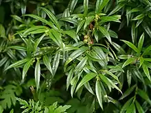 Sarcococca saligna, the sweet box or Christmas box, is a species of flowering plant in the family Buxaceae. This shrub is native to northern Pakistan. Its common name in Pakistan is sheha.[1][2]