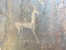 Most of the petroglyphs at Sarmishsay depict people and animals, including in hunting scenes. Included amongst the animals are Saiga antelope, wild mountain sheep and goat, elephant, lion, tiger, and cheetah. The pictures of auruch (wild cattle) are particularly important in helping archaeologists date the petroglyphs, as auruch became extinct in this area from over hunting in the 2nd millennium BC.[7] Not all of the images are true to life: there is a camel with three humps, and a man with two heads.[5] The petroglyphs made by Scythian artists during the Iron Age often show domesticated animals, which shows how society had developed by this time. There is an image of a shepherd on horseback, a Bactrian camel, and a dog, which might have been a pet.[2] The Scythians also made artworks of religious rites, including ecstatic dances, religious symbols, and even Zoroastrian priests worshipping at a fire temple.[7]