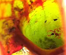 Most species use a combination of scent, waxy deposits (to clog insect feet) and gravity to topple insect prey into their pitcher. Once inside, the insect finds the footing very slippery with a waxy surface covering the walls of the pitcher. Further down the tube, downward-pointing hairs make retreat impossible, and in the lowest region of the tube, a pool of liquid containing digestive enzymes and wetting agents quickly drowns the prey and begins digestion. The exoskeletons are usually not digested, and over the course of the summer fill up the pitcher tube.