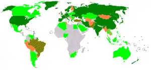 On 4 October 1957 the Soviet Union launched the world's first artificial satellite, Sputnik 1. Since then, about 8,900 satellites from more than 40 countries have been launched. According to a 2018 estimate, some 5,000 remain in orbit. Of those, about 1,900 were operational, while the rest have exceeded their useful lives and become space debris. Approximately 63% of operational satellites are in low Earth orbit, 6% are in medium-Earth orbit (at 20,000 km), 29% are in geostationary orbit (at 36,000 km) and the remaining 2% are in various elliptical orbits. In terms of countries with the most satellites, the USA has the most with 859 satellites, China is second with 250, and Russia third with 146. These are then followed by India (118), Japan (72) and the UK (52).[1] A few large space stations, including the International Space Station, have been launched in parts and assembled in orbit. Over a dozen space probes have been placed into orbit around other bodies and become artificial satellites of the Moon, Mercury, Venus, Mars, Jupiter, Saturn, a few asteroids,[2] a comet and the Sun.