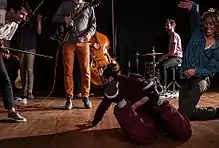 Satellite Ballet was founded in 2010 by Kevin Draper and Troy Schumacher after they met by chance at their apartment building in New York City and began to create an experimental ballet.[1][2] Draper's surrealistic poetry served as the interpretative foundation of Schumacher's choreography, an unconventional technique that transcended the typical method of developing choreography based on a piece of music.[1][3] Draper then introduced Schumacher to composer Nick Jaina, who had previously performed at Draper's art venue in Michigan.[2] Soon after, the three artists began collaborating with other artists on the ballet project: these artists became the founding artists of the Satellite Ballet. The founding artists agreed to an egalitarian structure in which all the artists and their diverse mediums of art were equal and deserved equal representation in projects.[4] For the first few years, the artists collaborated under the name Satellite Ballet but after Schumacher split from Satellite Ballet in 2013 to begin his own company, Satellite Collective reformed under new choreographers and performs under the name Satellite Collective.[4]