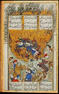 According to Annemarie Schimmel, the Mughal Emperor Akbar was averse to the practice of Sati; however, he expressed his admiration for "widows who wished to be cremated with their deceased husbands".[68] He was averse to abuse, and in 1582, Akbar issued an order to prevent any use of compulsion in sati.[68][69] According to M. Reza Pirbhai, a professor of South Asian and World history, it is unclear if a prohibition on sati was issued by Akbar, and other than a claim of ban by Monserrate upon his insistence, no other primary sources mention an actual ban.[70] Instances of sati continued during and after the era of Akbar.[71][72] For example, according to a poem, Sūz u gudāz ("Burning and melting") by Muhammad Riza Nau'i of Khasbushan (d. 1610), Akbar attempted to prevent a sati by calling a widow before him and offering her wealth and protection. The poet reports hearing the story from Prince Dāniyāl, Akbar's third son. According to Arvind Sharma, a professor of Comparative Religion specializing on Hinduism, the widow "rejected all this persuasion as well as the counsel of the Brahmans, and would neither speak nor hear of anything but the Fire".[73][note 4]