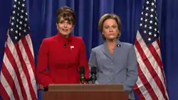 The first sketch, "A Nonpartisan Message from Governor Sarah Palin & Senator Hillary Clinton," aired during the thirty-fourth season premiere of SNL on September 13, 2008. The sketch starred Tina Fey and Amy Poehler as Palin and Clinton, respectively.[8] Fey, the series' former head writer and repertory player, made her third appearance on the series since officially leaving SNL in 2006 to work on 30 Rock, a series which she created.[9] The sketch was written by Poehler, Fey, and head writer and Weekend Update anchor Seth Meyers.[10]