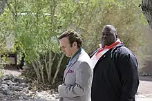 Nacho and Lalo Salamanca involve Jimmy in the Salamanca drug business when they hire him to gain Domingo Molina's release from jail by having him pose as a confidential informant for DEA Agent Hank Schrader.[57] Jimmy later represents Lalo when he is arrested for murder. Gus Fring, the rival in the drug business to the Salamancas, wants Lalo released, so Mike provides information that enables Jimmy to persuade a judge to grant bail of $7 million cash. Jimmy agrees to accept $100,000 in exchange for transporting the money from a remote desert site. He picks up the cash from Leonel and Marco Salamanca (the Cousins), but on his return trip is attacked by several gunmen. Mike was tracking Jimmy for Gus and kills all but one attacker. Jimmy's car breaks down, forcing them to hide the car from the remaining attacker and trek cross-country with the money. They walk for two days and work together to kill the remaining gunman before they are able to call for help.[58] The events leave Jimmy suffering from post-traumatic stress.[59]