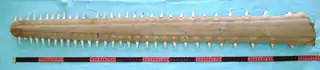 The most distinctive feature of sawfish is their saw-like rostrum with a row of whitish teeth (rostral teeth) on either side of it. The rostrum is an extension of the chondrocranium ("skull"),[27] made of cartilage and covered in skin.[33] The rostrum length is typically about one-quarter to one-third of the total length of the fish,[5] but it varies depending on species, and sometimes with age and sex.[1] The rostral teeth are not teeth in the traditional sense, but heavily modified dermal denticles.[34] The rostral teeth grow in size throughout the life of the sawfish and a tooth is not replaced if it is lost.[34][35] In Pristis sawfish the teeth are found along the entire length of the rostrum, but in adult Anoxypristis there are no teeth on the basal one-quarter of the rostrum (about one-sixth in juvenile Anoxypristis).[36][37] The number of teeth varies depending on the species and can range from 14 to 37 on each side of the rostrum.[2][38][note 1] It is common for a sawfish to have slightly different tooth counts on each side of its rostrum (difference typically does not surpass three).[39][40] In some species, females on average have fewer teeth than males.[1][39] Each tooth is peg-like in Pristis sawfish, and flattened and broadly triangular in Anoxypristis.[2] A combination of features, including fins and rostrum, are typically used to separate the species,[2][38] but it is possible to do it by the rostrum alone.[41]