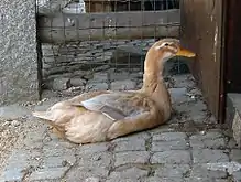 The Saxony has only one colour variety, buff-blue mallard:[lower-alpha 1] the drake has a greyish-blue head, white neck-ring, and rust- or chestnut-coloured breast feathers; the duck is a rich, light buff colour with two white stripes on each side of the face, one over the eye and the other from the eye towards the beak.[10] Both drakes and ducks have a yellowish bill and orange legs and feet, although the standard specifies dark yellow.[6]:5