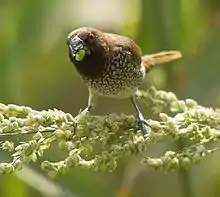The scaly-breasted munia or spotted munia (Lonchura punctulata), known in the pet trade as nutmeg mannikin or spice finch, is a sparrow-sized estrildid finch native to tropical Asia. A species of the genus Lonchura, it was formally described and named by Carl Linnaeus in 1758. Its name is based on the distinct scale-like feather markings on the breast and belly. The adult is brown above and has a dark conical bill. The species has 11 subspecies across their range and differ slightly in size and color.