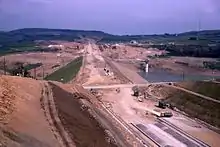 Surveying began in November 1961 and the route of the carriageway was determined in mid 1963. Excavation in the Deanhead Valley commenced the following year and for the dam in 1966. This required the removal of 713,000 cubic metres (25,200,000 cu ft) of peat bog to reach the solid rock base nearly 13 metres (43 ft) below ground level. Material excavated elsewhere on the line of the motorway, clay from cuttings between Lofthouse and Gildersome, and 3.4 million cubic metres from the Deanhead excavations was used to build the dam's embankment which is 625 metres (2,051 ft) in length and 63.1 metres (207 ft) above the original valley floor. The 3.6 million cubic metre embankment is 435 metres (1,427 ft) wide at its base and 55 metres (180 ft) at road level.[3]