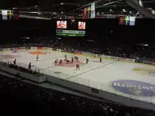 The ice hockey rink measures 61 meters × 30 meters (200 ft × 98.5 ft) which is standard international size. New double frame half boards were installed in 2001, designed to switch to NHL rink dimensions or to be easily removed when other events than ice hockey take place.[4] To maximize the view for spectators, a seamless protective glass barrier consisting of tempered glass panels clipped together at their top corners with clear plastic brackets is used instead of traditional Plexiglas with metal dividers.[4]