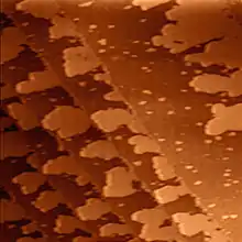 One-atom-thick silver islands grown on terraces of the (111) surface of palladium. Image size is 250 nm by 250 nm.