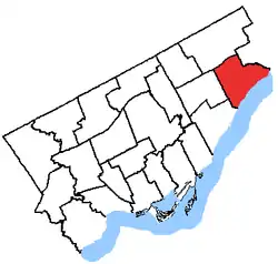 It is centred on the Guildwood neighbourhood. It consists of the part of the City of Toronto bounded by a line drawn from Lake Ontario north along Markham Road, west along Eglinton Avenue, north along Bellamy Road South, west along Lawrence Avenue, north along McCowan Road, east along Highway 401, south along Morningside Avenue back to Lake Ontario.