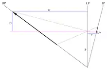 If v′ is the distance along the line of sight from the image plane to the center of the lens, the angle ψ between the image plane and the PoF is given by[lower-alpha 3]