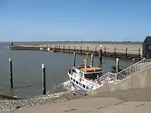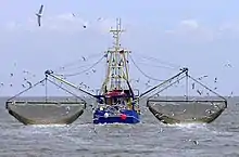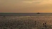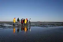 The national park has 70 neighbouring communities in Schleswig-Holstein with 290.000 people living there. Additionally approximately 15 Million people visit the national park every year.[43] The area of the Wadden Sea National Park is harnessed by tourism, fishery, oil production, coastal defence, grazing, maritime traffic and air traffic, withdrawal of gravel and sand, mussel cultivation and sometimes used for military weapon testing. Most of the utilisation is located directly near or at the coast, so the seaward area is more or less unaffected by human influences.[2] Since the amendment of the second national park law in 1999 mainly voluntary agreements coordinate the limitation in human utilisation of the Wadden Sea. The consideration of traditional usages highly increased the approval of the national park by locals.[44] Since 1987 utilisations, which hardly affect the ecosystem Wadden Sea at all, are allowed again by law. Such utilisations are e.g. collecting small amounts of plants for science or education.[12]