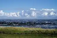 Over 2/3 of the national park are covered with water permanently (sublittoral), 30% of mudflat that is lying dry during low tide and gets flooded with water during high tide (eulittoral).[11] The rest is land area that only gets flooded under certain conditions (supralittoral). The water areas contain the offshore part of the park as well as huge tidal currents like the Lister Tief, the Heverstrom, the Purrenstrom, the Wesselburener Loch or the Piep. Outside the mudflat area runs a constantly strong current from south to north, coming from the southern North Sea and going on to the Norwegian Trench. Owing to the river mouths of several big European waters (like the Rhine or Elbe), the current´s salinity of 20–30 psu lies below that of the ocean, and above that of the river mouths.[5]