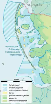 The national park divides into two zones that correspond to different levels of protection. Zone 1 has a size of 162.000 ha and covers a third of the whole national park. The zone consists of 12 bigger units which all contain marshland, intertidal estuarine mudflat, mixed sediment mudflat, sand flat, tidal creeks as well as deep and flat areas that are permanently under water (sublittoral). Additionally there are smaller units around sensible places like breeding areas of coastal birds, sandbars of seals, places where migratory birds moult or geomorphological meaningful areas with natural surface structure.[6] Zone 1 is principally closed for the public. Exceptions are made for the mudflat areas directly bordering the coastline, some routes for guided mudflat hiking tours and fishery.[7] South of the Hindenburgdamm, facing the landside of Sylt, a human use of the first zone is completely prohibited (Zero use zone). This part is 12.500 ha big, whereof 3500 ha are permanently covered with water.
