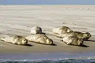 A great number of harbour porpoises live in the national park.[14] The Wadden Sea is also home to harbour seals and grey seals. According to the official counting of the National park Administration, about 13.000 harbour seals are living in the Wadden Sea of Schleswig-Holstein (2017). Nearly half of the seal population died during the "Seehundstaupe" epidemic in 1988 and 2002.[16] The National Park Administration assumed that one third of the harbour seal population was swimming or hunting during the counting so the number had to be adjusted.[17] The grey seal population consists of 140 animals and is mainly located on the "Jungnamensand" sand bar and the "Knobsand" sand bars near the island Amrum.[18]