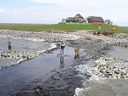 Coastal defence has a higher priority than nature conservation measurements, even in the national park area. Along the North Sea coast new dikes are being built and old dikes will be amplified according to the sea level rise. In some areas, e.g. at the west coast of Sylt eroded beach material is replaced through beach nourishment. But compared to other marine national parks coastal defence has always been a part of the Wadden Sea. The Wadden Sea wouldn’t be the same today if not for coastal protection over centuries.[2] For example drainage channels were dug in the Dark Age in salt marsh areas. Even today the channels change the originally amphibious character of the biotope.