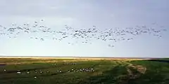 The avifauna of the national park is comparable with avifaunae of other Wadden Sea regions. With over 10 million birds in spring and autumn the trilateral Wadden Sea accommodates the most birds in Europe.[12] The nutrition-rich area is visited by migratory birds regularly. Due to the ongoing changes in the Wadden Sea the effects of the national park on the avifauna are hard to quantify. From 1994 to 2004 only three bird species (European spoonbill, Great cormorant, common ringed plover) increased in number. In the same period, the stock of 18 other species shrank including barnacle goose, common greenshank, Eurasian curlew, black-headed gull, lesser black-backed gull, Eurasian oystercatcher, pied avocet and dark bellied brent goose.[22]