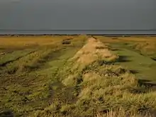 Salt marshes are the dominant landscape in the transition zone between open sea and inland. They are regularly flooded between 10–250 times a year depending on the tidal range. Salt marshes build different zones relative to the local salinity. The lower marsh zone which is flooded the most has a higher salinity than the upper marsh zone which is less frequently flooded because of the higher elevation. In total about 50 species of flowering plants can be found in the local salt marshes. In low elevation areas plants like common salt marsh grass (Puccinellia maritima), sea-aster (Hordeum marinum), sea-blite (Sueda maritima) and sea-purslane (Halimione portulacoides) are characteristic. High elevation areas are a lot more diverse in plant species. Common plants are seaside centaury (Centaurium littorale), red eyebright (Odontites rubra), see plantain (Plantago maritima) and distant sedge (Carex distans).[15]
