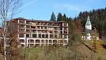 Schloss Elmau, built by the philosopher and theologian Johannes Müller between 1914 and 1916,[1] is a four-story national monument with hipped roof, tower and porch, situated between Garmisch-Partenkirchen and Mittenwald in a sanctuary of the Bavarian Alps, Germany. It lies at the foot of the Wetterstein mountains in a Naturschutzgebiet (nature reserve), belonging to the Krün municipality.