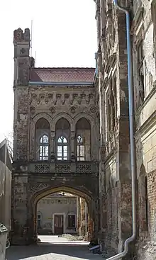 Both of the side wings have escalated frontage, each level is decorated with profiled quatrafoil and a little roof over it. The shape of the frontage copies the shape of a saddle roof, whilst it is taller and makes the wings appear more monumental than they actually are. It may appear that the side wings were not jointed to the main wing in the first place since the profilation of the frontage is repeated on the other side of the side wings facing the main wing just a couple of meters far from it. Since the side wings were originally used as stable there are only three small front windows in a row, centrally placed on the wall. All the windows are exactly alike; with a pointed arch on the top and no extra decoration.