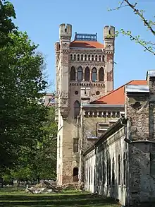 The main wing is now being reconstructed since it was in almost fatal condition. The wing is a two storied residence with one dominating feature - a four storied tower on the west side. The whole wing escalates from the bottom to the top. The plinth is simple stone work, just as the first floor. The windows have rectangular shape, but apparently used to have a pointed arc on the top. The cornice dividing the first and the second floor is also rustic and minor. While on the second floor, the windows are decorated with a simple edicule without any tympanon. The windows are united by another plain cornice. The chateau does not have a whole entablature, only the cornice and an arc-shaped frieze with added blind circle windows.