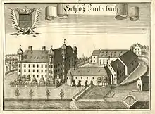 The Lauterbach estate was established by the first half of the 13th century. The Dachau family made Lauterbach their seat from around 1250 to 1437. The castle then passed through marriage to Veit von Eglofstein. He and his wife sold the castle in 1449, and there were various changes of ownership in the next hundred years. In 1550 Jörg or Georg Hundt zu Lauterbach und Valkenstein took possession and restored the castle. At this time it was a tall rectangular building surrounded by a thick ring wall, with defensive towers in the four corners. The castle was damaged during the Thirty Years' War (1618–1648).[2] By the end of the war it had been burned down.[3] In the second half of the 17th century Johann Franz Maximilian Servatius von Hundt undertook a major restoration, depicted in engravings by Michael Wening.[2]