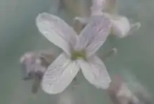 The inflorescence is a raceme of mustardlike flowers. Each flower has purple sepals and four centimeter-long white or pale purple petals with purple veining.