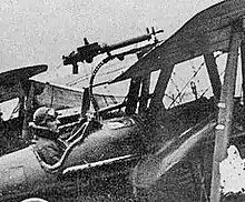 The Sopwith Dolphin, which entered service near the end of World War I, was armed with two forward-firing .303 in (7.7 mm) Vickers on the cowl, just forward of the cockpit; it could also carry a pair of .303 in (7.7 mm) Lewis guns on the forward cross-tube of the cabane strut structure, aimed forwards and upwards, and were so equipped on delivery from the makers. The Germans tried similar arrangements in 1917, when Gerhard Fieseler of Jasta 38 attached two machine guns to an Albatros D.V, pointing upwards and forwards.
