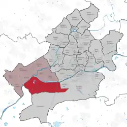 Location of Schwanheim (red) and the Ortsbezirk West (light red) within Frankfurt am Main | |
