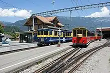 The line initially runs alongside the BOB for just over 0.5 km (0.31 mi) before crossing the Lütschine river and starting its climb up the valley side. Initially it passes through forest, with a passing loop at Rotenegg at an altitude of 886 m (2,907 ft). The forest is followed by alpine pastures which offer views of the Bernese Oberland including the town of Interlaken bracketed by Lake Thun and Lake Brienz. Another passing loop is located at Breitlauenen station, the line's only intermediate station at an altitude of 1,542 m (5,059 ft).[1][3]