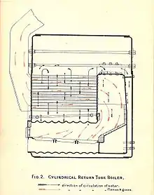 The general layout is that of a squat horizontal cylinder. One or more large cylindrical furnaces are in the lower part of the boiler shell. Above this are many small-diameter fire-tubes. Gases and smoke from the furnace pass to the back of the boiler, then return through the small tubes and up and out of the chimney. The ends of these multiple tubes are capped by a smokebox, outside the boiler shell.[1]
