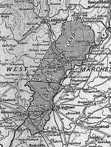 The Debatable Lands, also known as "Debatable ground", "Batable ground", or "Threpe" – a Scots term meaning "something that is argued over"[3] – were in the West Marches, bounded on the west by the River Sark, to the east by the River Esk and Liddel Water, on the north by the Bruntshiell Moor and Tarras Moss, and on the south by the estuary of the Esk. The area was about ten miles from north to south and three and a half from east to west at its widest part.[4] Canonbie was the main population centre within the debatable lands.