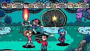 Loosely following the story of the graphic novels, up to four players can play as Scott Pilgrim, Ramona Flowers, Kim Pine or Stephen Stills (along with the unlockable character NegaScott and the downloadable characters Knives Chau and Wallace Wells), who must battle through seven levels in order to defeat Ramona's seven evil exes. Characters have their own individual movesets, which can be expanded upon by gaining enough experience, and are also able to use weapons. Each player has Heart Points and Guts Points, the latter of which can revive players if they are knocked out, or be used to perform special moves such as summoning Knives Chau or the unlockable assist character Mr. Chau. Defeating enemies earns coins which can be spent in shops to purchase items that can replenish health or boost stats. Certain items can be taken 'to go' to be automatically used when the player runs out of health.[6] Players can also enter Subspace areas which act as bonus areas where extra coins can be earned. During co-operative play, players can revive fallen comrades at the cost of some money, give each other health or money and simultaneously taunt for a combined attack. Various cheat codes unlock extra features, such as a Sound Test, a Boss Rush and a Survival Horror mode.[7]