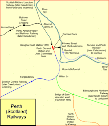 In the 1846 session of Parliament, several SCR branches were authorised: that to Crieff from what was later Gleneagles (capital £160,000); to Denny from Larbert (capital £50,000); to South Alloa from a junction north of Larbert (and to Tillicoultry by ferry at Alloa, capital £115,000); and to Perth Harbour and other facilities there (capital £80,000).[3] The location of the Perth main station was also finalised; earlier proposals to site it (and three other railways' terminus stations) at the high-amenity South Inch had led to strenuous opposition in Perth; now it would be located to the west. However one important Bill failed: the amalgamation with the E&GR required Parliamentary approval and this was withheld on 29 July 1847.[1]