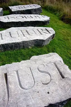 Paris continued to be a major destination for Scottish artists, with William Gear (1916–97) and Stephen Gilbert (1910–2007) encountering the linear abstract painting of the avant-garde COBRA group there in the 1940s. Their work was highly coloured and violent in execution.[108] Also a visitor to Paris was Alan Davie (born 1920),[109] who was influenced by jazz and Zen Buddhism and moved further into abstract expressionism.[96] Ian Hamilton Finlay's (1925–2006) work explored the boundaries between sculpture, print making, literature (especially concrete poetry) and landscape architecture. His most ambitious work, the garden of Little Sparta opened in 1960.[110]